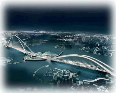 Англия, 'мост тысячелетия'. Состоит из двух арок - опора и, собственно, мост. Когда нужно пропустить корабль, арку поднимают.